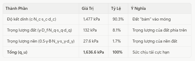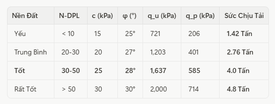 Kết Luận: Độ kết dính của đất là yếu tố chính (90%). Đó là lý do tại sao khảo sát địa chất DPL là bắt buộc – nó xác định độ kết dính, từ đó xác định sức chịu tải thực tế.